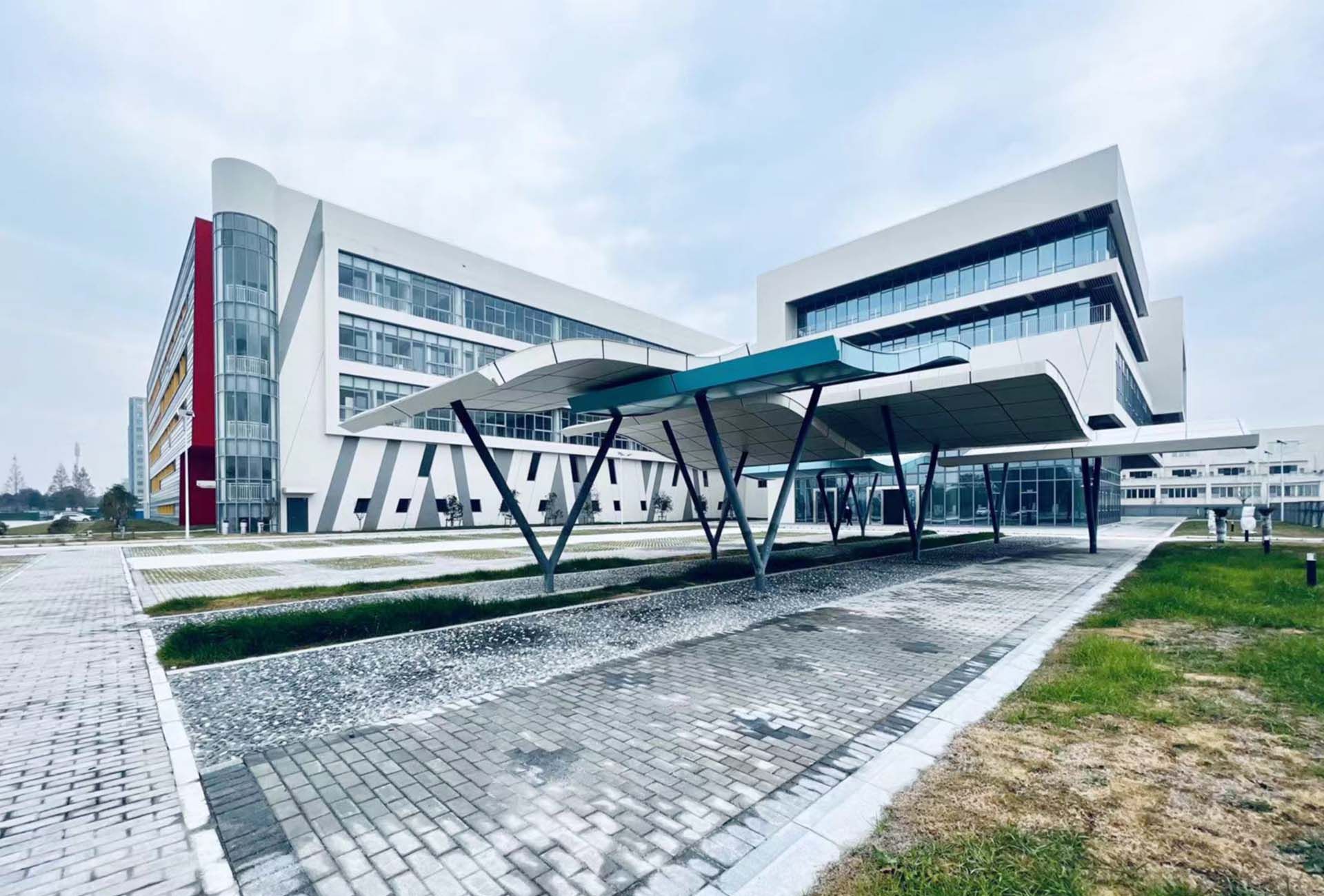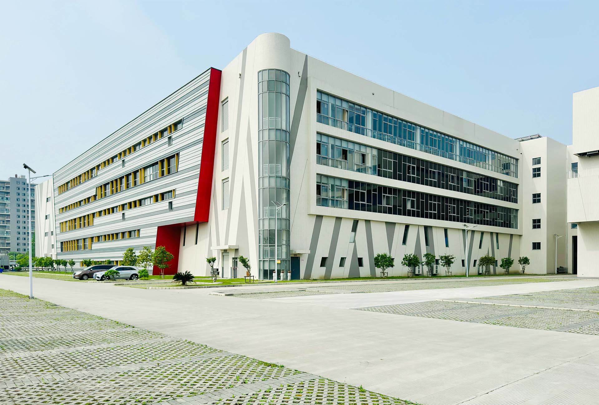 設計上依照用途分棟形成各自獨立的建築群,而彼此之間以空橋、中庭等連結成一完整的工作環境,並利用中介空間置入可暫停休憩的生活區域,塑造良好的工作環境。辦公棟、廠房、倉庫等,各自以不同的立面形式形成自明性的同時,藉由重複類似的立面語彙也將各棟整合為一體。面對主要計畫道路的東向長立面,利用皮層的退縮創造豐富活潑的表情,也讓城市景觀與企業形象能互相彰顯。